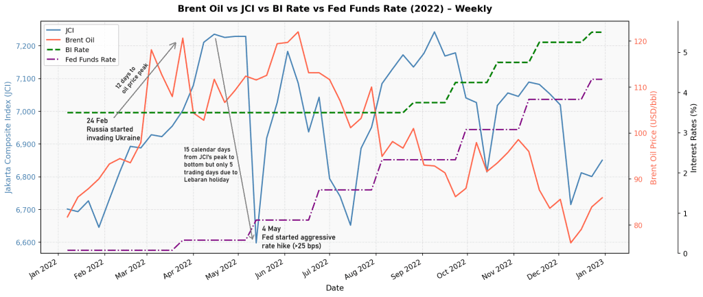 Dalam kasus 2022, harga minyak mencapai puncaknya sekitar 12 hari setelah invasi dimulai, sementara IHSG mencapai titik terendah sekitar dua minggu setelahnya.